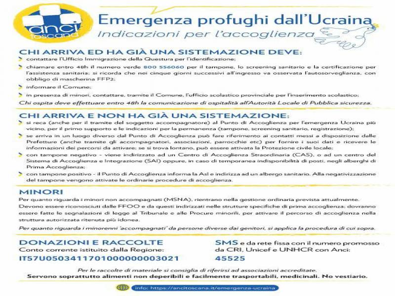 Sul sito della Prefettura di Pisa a questo link www.prefettura.it/pisa e sul sito della Regione Toscana a questo link www.regione.toscana.it sono disponibili tutte le indicazioni utili per l'accoglienza dei profughi ucraini, che di seguito riportiamo sinteticamente.