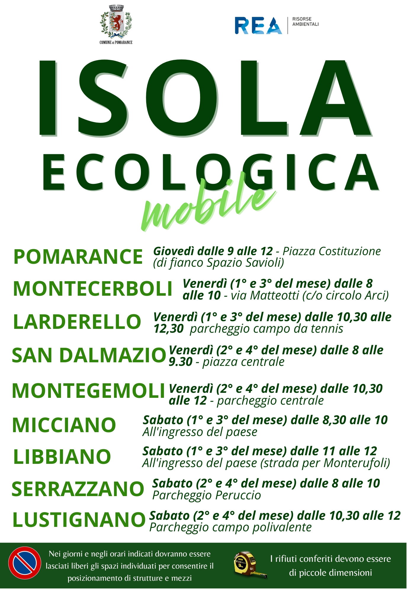 Dal giorno 27/04/2023 è attivo il servizio dell'Isola Ecologica Mobile che, secondo un calendario prestabilito, sosterà in modo ciclico nei vari paesi.