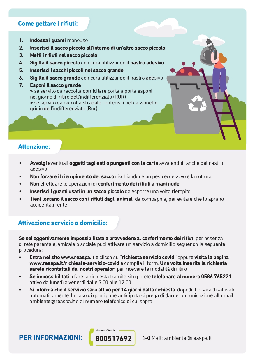 I rifiuti prodotti andranno pertanto conferiti, in maniera indifferenziata e nei giorni stabiliti dal calendario dell'indifferenziato che a Pomarance è il martedì, con le modalità riportate nel volantino REA